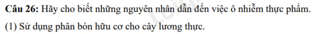 Câu 26: Hãy cho biết những nguyên nhân dẫn đến việc ô nhiễm thực phẩm.