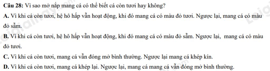 Câu 28: Vì sao mở nắp mang cá có thể biết cá còn tươi hay không?
