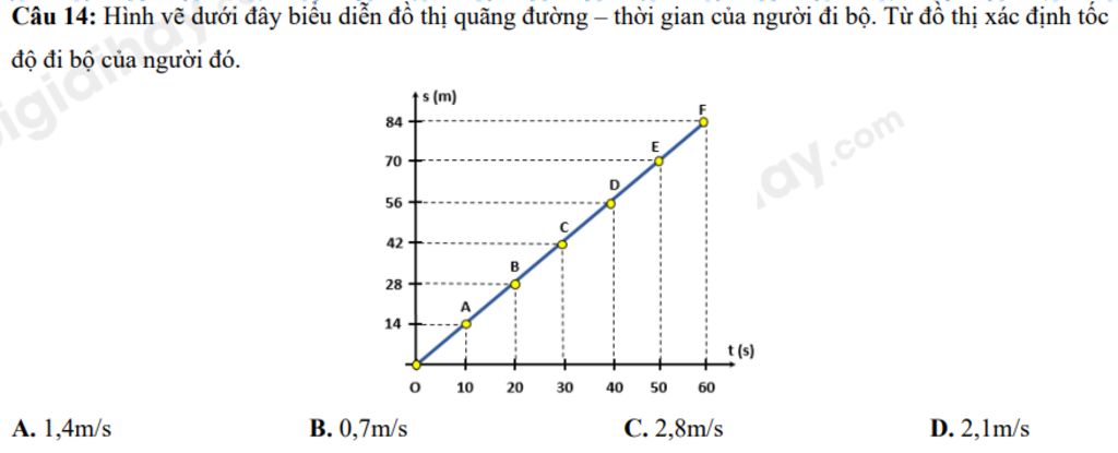 Câu 14: Hình vẽ dưới đây biểu diễn đồ thị quãng đường – thời gian của người đi bộ. Từ đồ thị xác định tốc độ đi bộ của người đó.