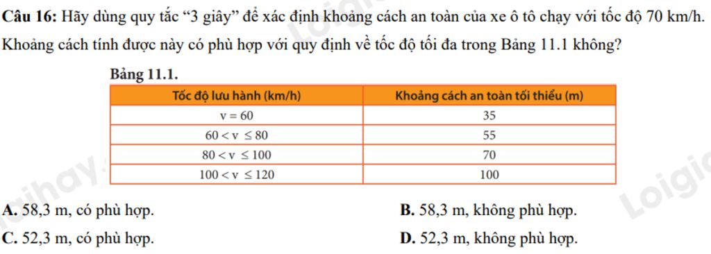 Câu `16:` Hãy dùng quy tắc “`3` giây” để xác định khoảng cách an toàn của xe ô tô chạy với tốc độ $70 km/h$. Khoảng cách tính được này có phù hợp với quy định về tốc độ tối đa trong Bảng $11.1$ không?