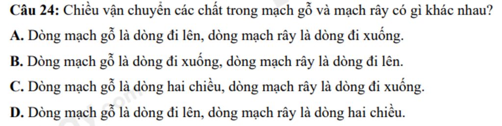 Câu 24: Chiều vận chuyển các chất trong mạch gỗ và mạch rây có gì khác nhau?
