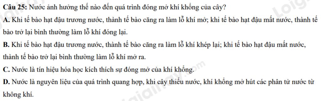 Câu 25: Nước ảnh hưởng thế nào đến quá trình đóng mở khí khổng của cây?