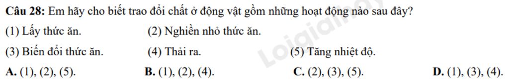 Câu 28: Em hãy cho biết trao đổi chất ở động vật gồm những hoạt động nào sau đây?