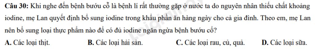 Câu 30: Khi nghe đến bệnh bướu cỗ là bệnh lí rất thường gặp ở nước ta do nguyên nhân thiếu chất khoảng iodine, mẹ Lan quyết định bổ sung iodine trong khẩu phần ăn hàng ngày cho cả gia đình. Theo em, mẹ Lan nên bổ sung loại thực phẩm nào để có đủ iodine ngăn ngừa bệnh bướu cổ?