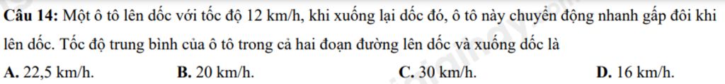 Câu `14:` Một ô tô lên dốc với tốc độ $12 km/h$, khi xuống lại dốc đó, ô tô này chuyển động nhanh gấp đôi khi lên dốc. Tốc độ trung bình của ô tô trong cả hai đoạn đường lên dốc và xuống dốc là :