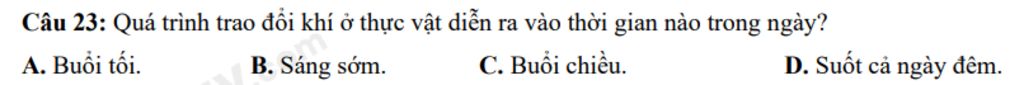 `-` Câu `23:` Quá trình trao đổi khí ở thực vật diễn ra vào thời gian nào trong ngày`?`