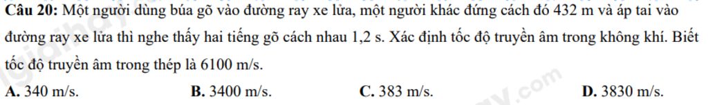 Câu `20:` Một người dùng búa gõ vào đường ray xe lửa, một người khác đứng cách đó `432 m` và áp tai vào đường ray xe lửa thì nghe thấy hai tiếng gõ cách nhau `1,2 s`. Xác định tốc độ truyền âm trong không khí. Biết tốc độ truyền âm trong thép là $6100 m/s$.