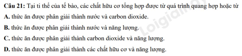 `21. Tại ti thể của tế bào, các chất hữu cơ tổng hợp được từ quá trình quang hợp hoặc từ thức ăn được phân giải thành carbon dioxide và năng lượng.