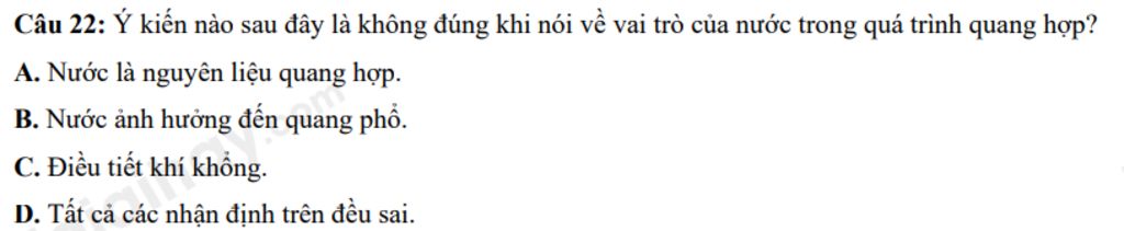Câu `22:` Ý kiến nào sau đây là không đúng khi nói về vai trò của nước trong quá trình quang hợp?