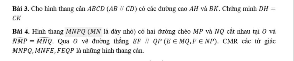 Bài 3. Cho hình thang cân ABCD (AB || CD) có các đường cao AH và BK. Chứng minh DH =