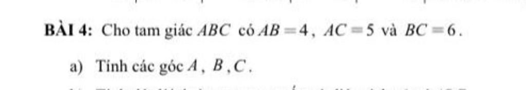 $cosA=$$\frac{4^2+5^2-6^2}{2.4.5}$$=\frac{1}{8}$