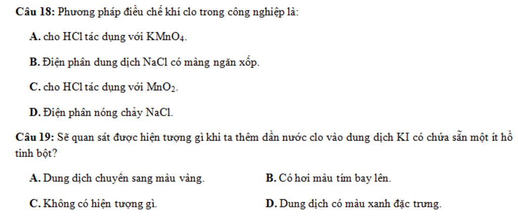 Câu 19: Sẽ quan sát được hiện tượng gì khi ta thêm dần nước clo vào dung dịch KI có chứa sẵ ...