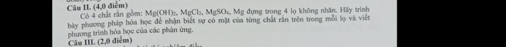 _ Thêm nước vào các mẫu thử chia thành 2 nhóm tan `(MgCl_2, MgSO_4)` và không tan `(MgO, Mg(OH)_2)`