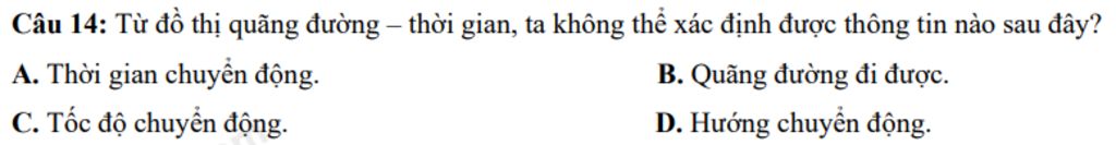 Câu 14: Từ đồ thị quãng đường – thời gian, ta không thể xác định được thông tin nào sau đây?