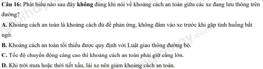 `=>` Khi trời mưa xấu, lái xe cần giữ khoảng cách an toàn tối thiểu lớn hơn