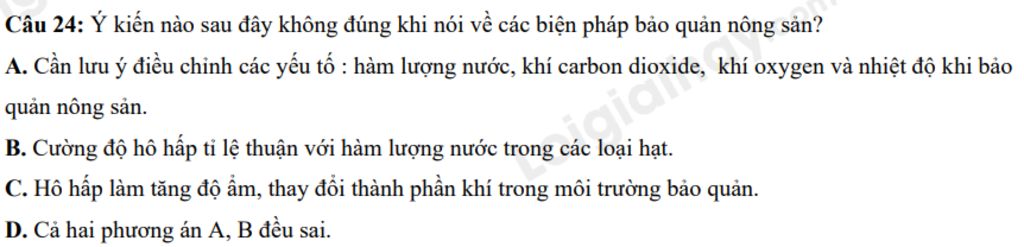 Câu 24: Ý kiến nào sau đây không đúng khi nói về các biện pháp bảo quản nông sản?