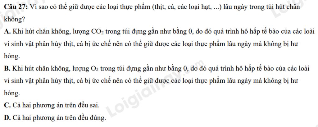 `->` Khi hút chân không, lượng O2 trong túi đựng gần như bằng `0`, do đó quá trình hô hấp tế bào của các loài vi sinh vật phân huỷ thịt, cá bị ức chế (hô hấp cần O2) nên có thể giữ được các loại thực phẩm lâu ngày mà không bị hư hỏng.
