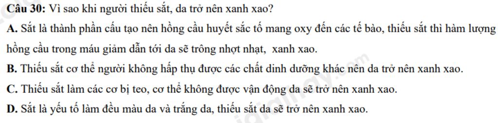 Người thiếu sắt, da trở nên xanh xao vì sắt là thành phần cấu tạo nên hồng cầu huyết sắc tố mang oxy đến các tế bào, thiếu sắt thì hàm lượng hồng cầu trong máu giảm dẫn tới da sẽ trông nhợt nhạt, xanh xao.