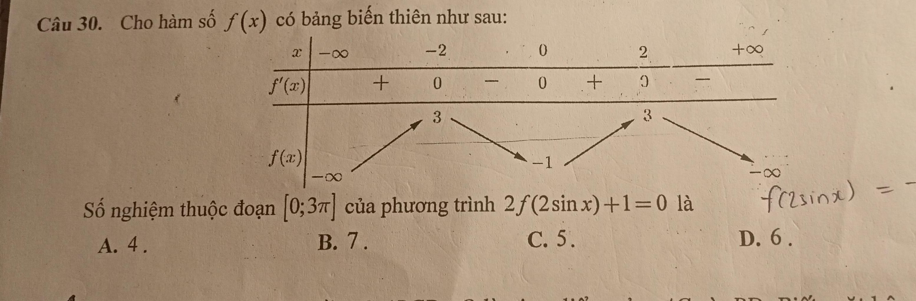 $2(f(2\sin x)+1=0\\ \Rightarrow f(2\sin x)=-\dfrac{1}{2}\\ \Rightarrow \left[\begin{array}{l} 2\sin x=a(a<-2)\\ 2\sin x=b(-2<b<0) \\ 2\sin x=a(0<c<2) \\ 2\sin x=d(d>2)\end{array} \right.\\ \Rightarrow \left[\begin{array}{l} \sin x=a'(a'<-1) (\text{Vô nghiệm})\\ \sin x=b'(-1<b'<0) \\ \sin x=c'(0<c'<1) \\ \sin x=d'(d'>1) (\text{Vô nghiệm})\end{array} \right.$