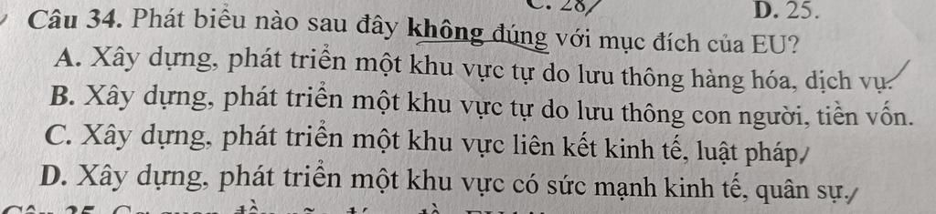 Câu 34. Phát biểu nào sau đây không đúng với mục đích của EU?