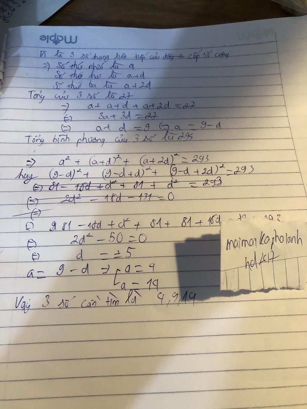 Ta có: $\begin{cases} U_{1}+U_{2}+U_{3}=27\\U_{1}^{2}+U_{2}^{2}+U_{3}^{2}=293 \end{cases}$