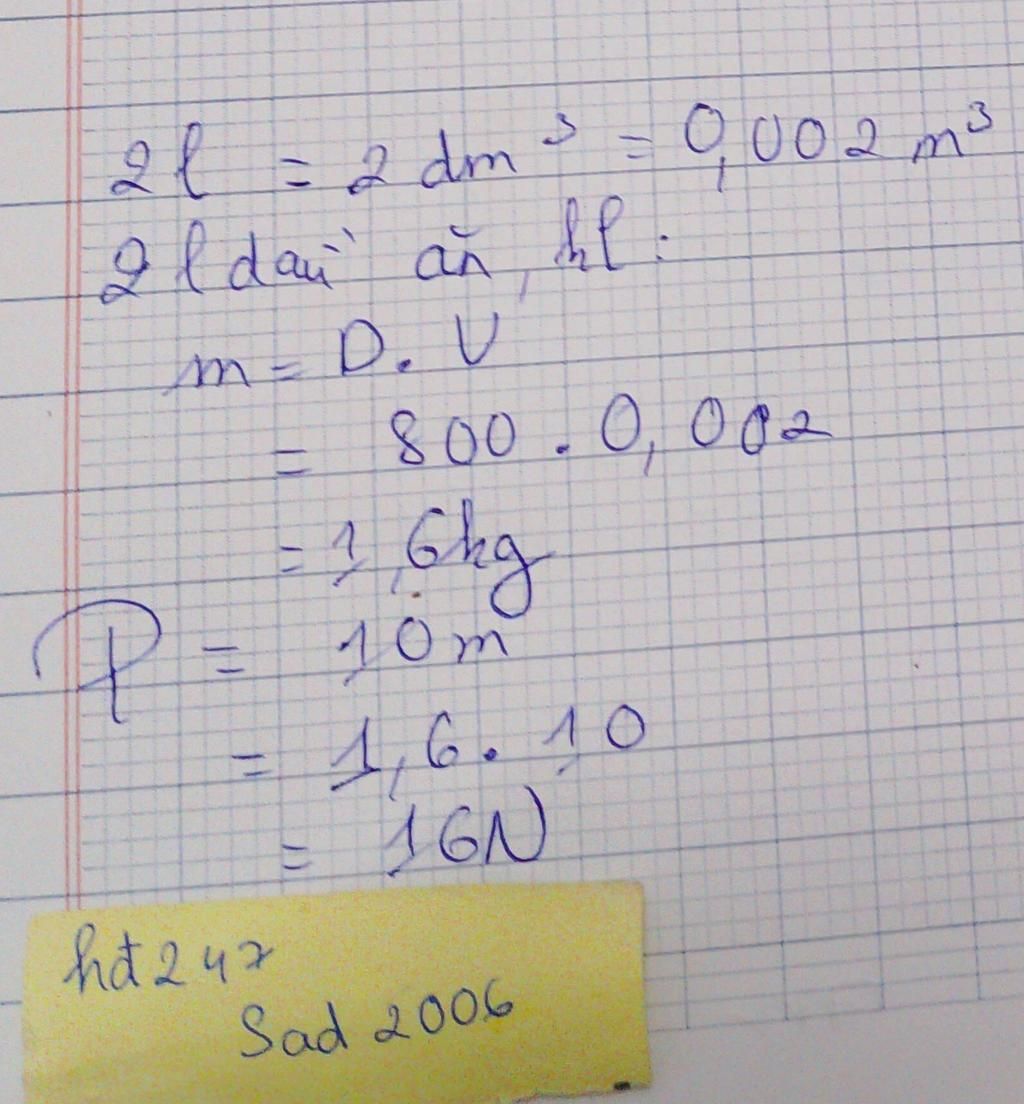 Ta có 2 lít = 2dm mũ 3 = 0,002m mũ 3