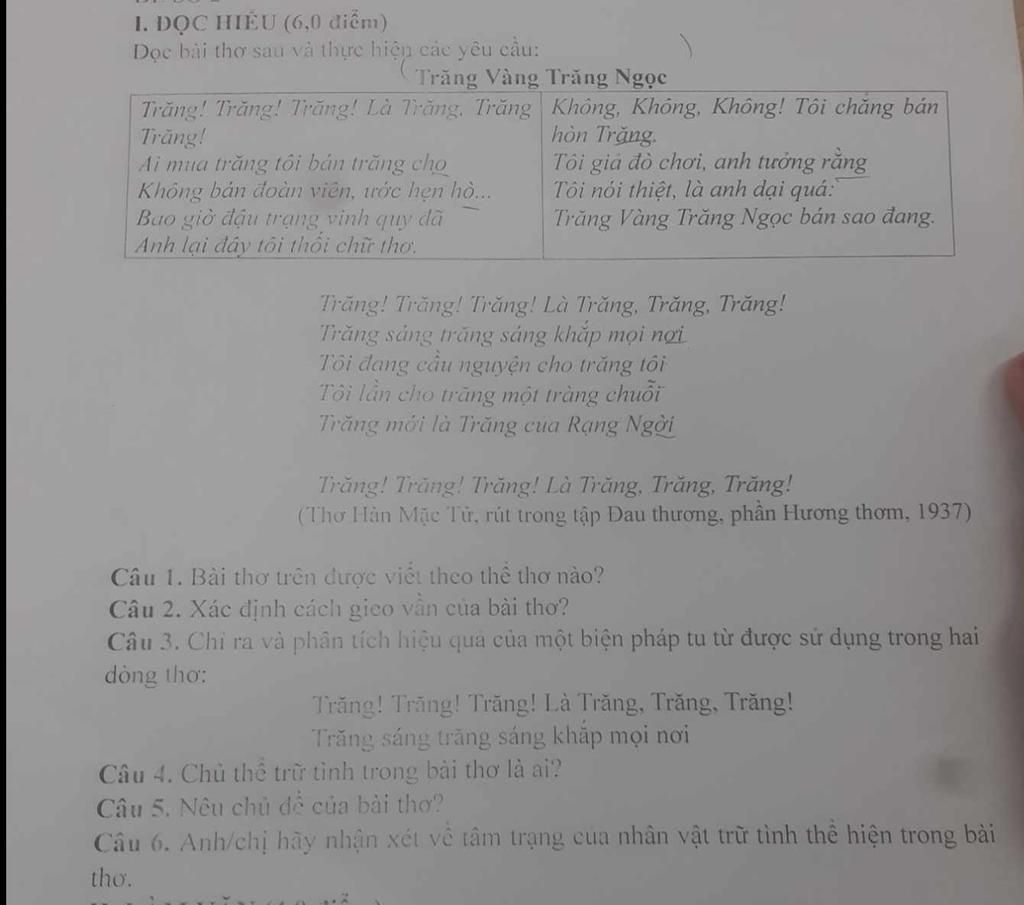 Dọc bài thơ sau và thực hiện các yêu cầu: