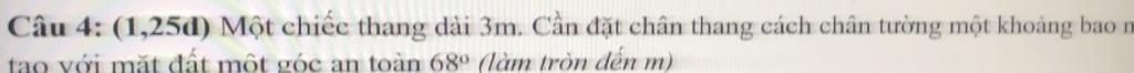 Vậy cần đặt chân thang cách chân tường `1` m để tạo với mặt đất góc an toàn `68^\circ`
