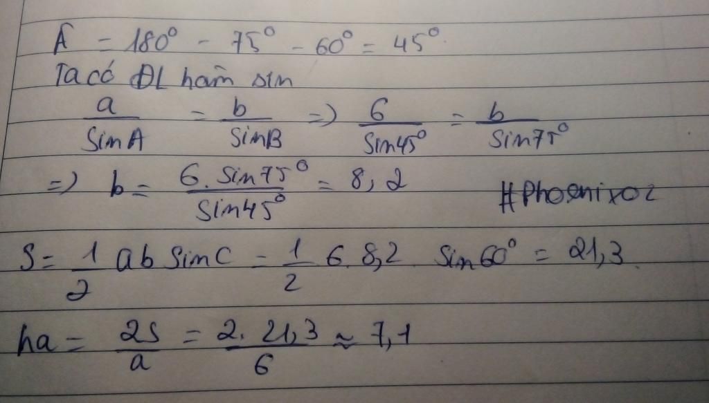=>b=a×sinB/sinA=6×sin75°/sin45°~8,2