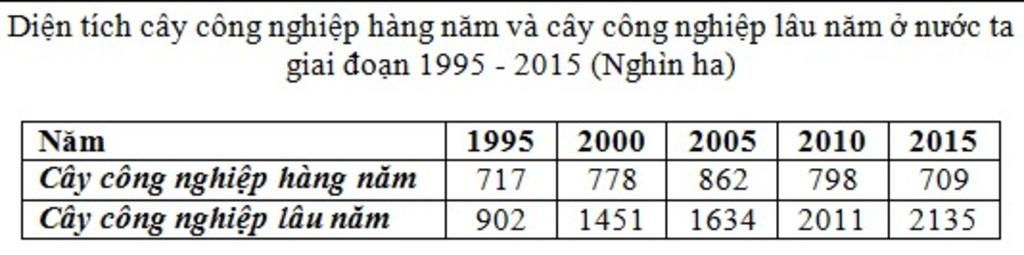 `=>` Giaithich : Nhìn chung diện tích cây trồng lâu năm và hằng năm đều có sự thay đổi khác nhau. Diện tích cây công nghiệp lâu năm tăng nhanh từ `902` nghìn ha năm `1995` lên `2135` nghìn ha năm `2015` , tăng `1233` nghìn ha và tăng gấp `2,4` lần. Diện tích cây công nghiệp hằng năm không ổn định giai đoạn `1995 -2005` có xu hướng tăng nhưng lại giai đoạn sau đó giảm còn `709` nghìn ha