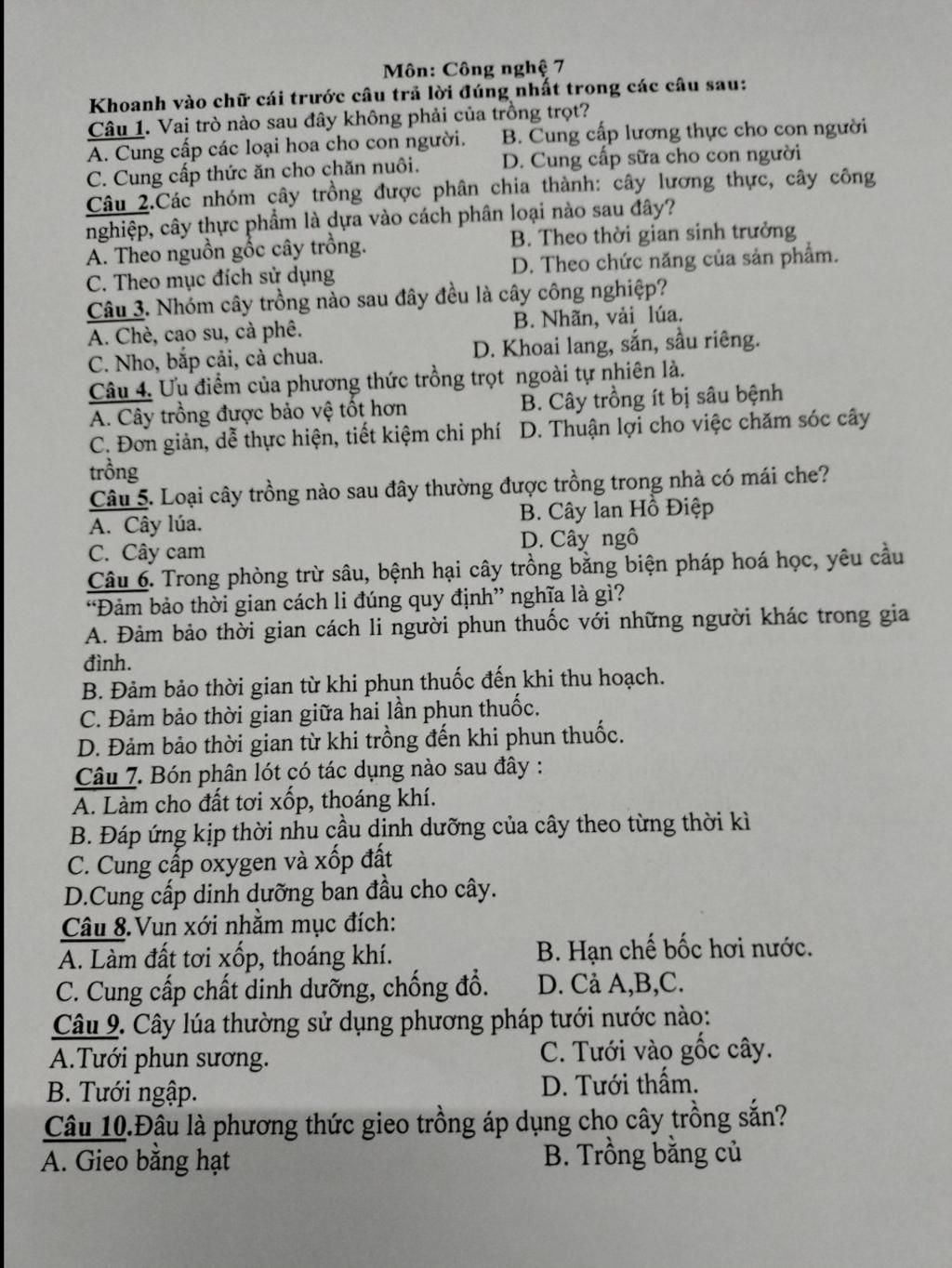 Câu 10: A.Gieo bằng hạt B.Trồng bằng củ C.Trồng bằng hom D.Trồng bằng cây con
