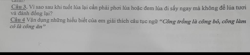 Câu 3 : Sau khi tuốt lúa lại cần phải phơi lúa hoặc đem đi sấy lúa ngay mà không để lúa tươi đánh đống lại vì lúa mới thu hoạch thường có độ ẩm cao từ 20 - 27%. Để lúa không bị hư hỏng hoặc giảm phẩm chất thì trong vòng 48 giờ sau khi thu hoạch phải làm khô lúa để độ ẩm chỉ còn 20%. Khi thóc có độ ẩm 13 - 14% có thể bảo quản được từ 2 - 3 tháng, nếu muốn bảo quản dài hơn 3 tháng thì độ ẩm của thóc tốt nhất từ 12 - 12,5% nên cần phải đem đi sấy ngay tránh tình trạng thóc ngấm nước, hư hỏng.