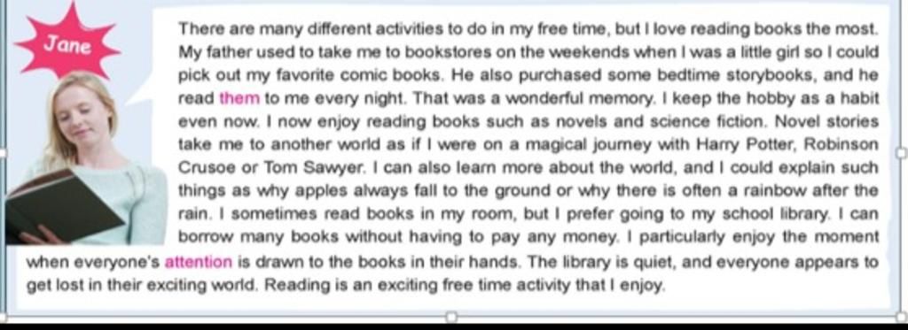 `-` Dẫn chứng "There are many different activities to do in my free time, but I love reading books the most."