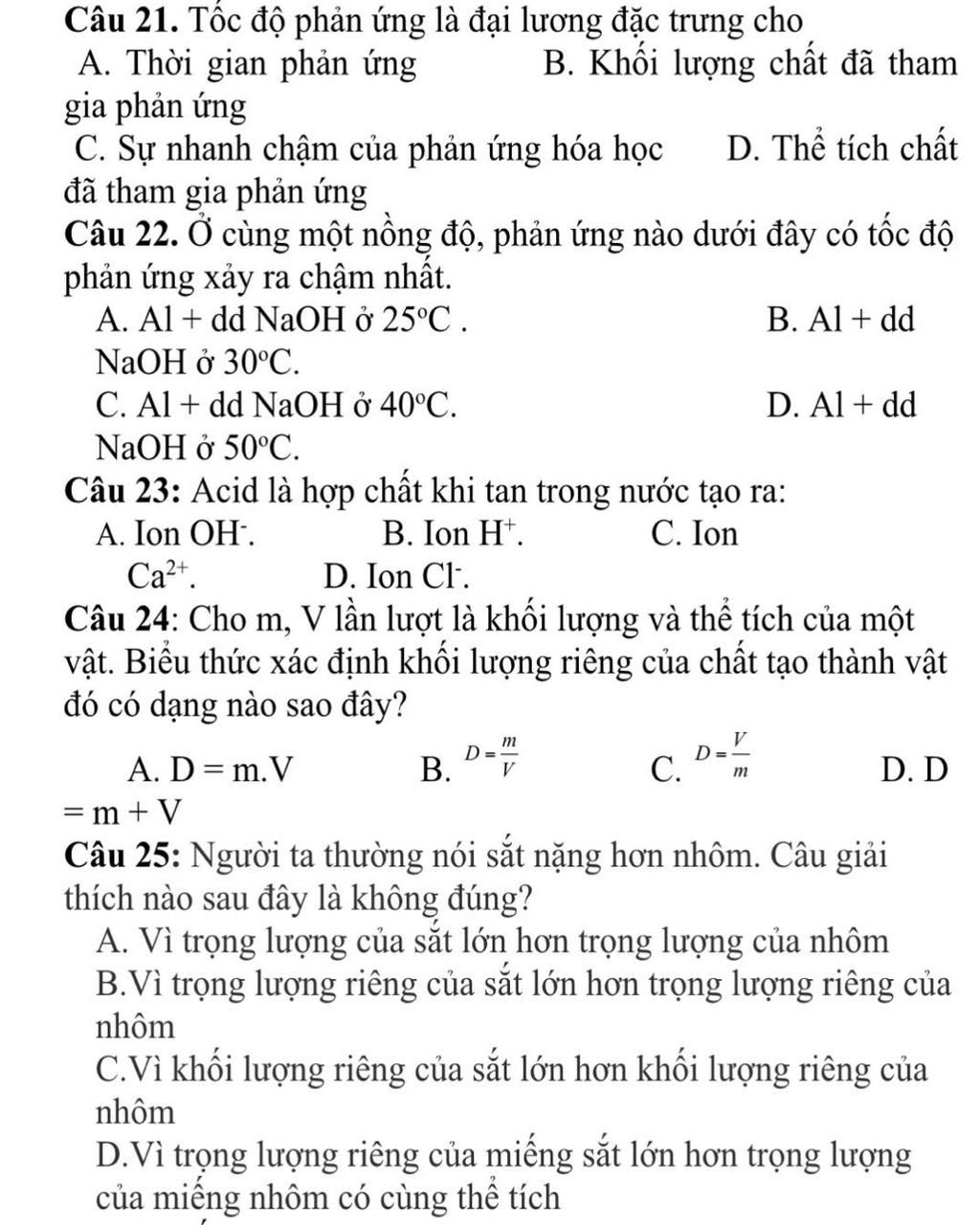 Câu 21: Tốc độ phản ứng rồi đại lượng đặc trưng cho sự nhanh chậm của phản ứng