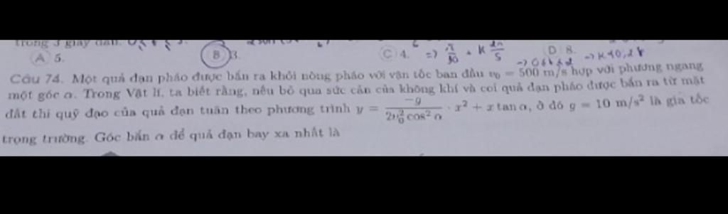 Ta có vì $v_0=500m/s, g=10m/s^2$ nên nên ta có phương trình quỹ đạo của quả đạn là