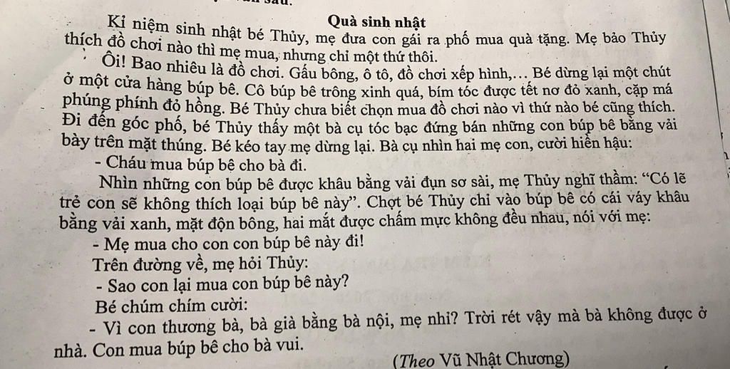 sinh nhật bé thủy mẹ của bé thủy đưa ra phố mua quà thấy bà cụ bán búp bê : thể hiện cô bé thủy thương bà cụ khi đang bán búy bê vào rét với lại rất yêu thương bà nội mình