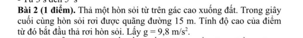 `=>` Độ cao là `: S = h = 1/2 . g .t^2 = 1/2 . 9,8 . 2^2 = 19,6 ( m )`