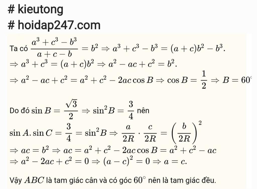 Vậy tam giác cân và có góc 60 độ nên là tam giác đều