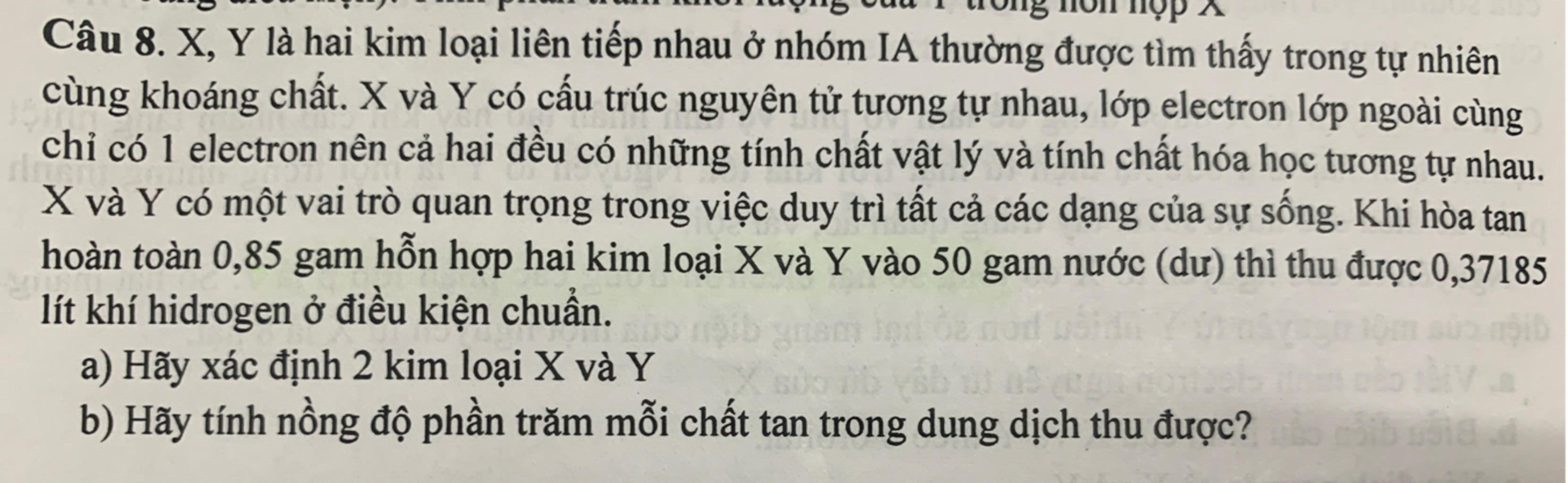 Câu 8. X, Y là hai kim loại liên tiếp nhau ở nhóm IA thường được tìm thấy trong tự nhiên