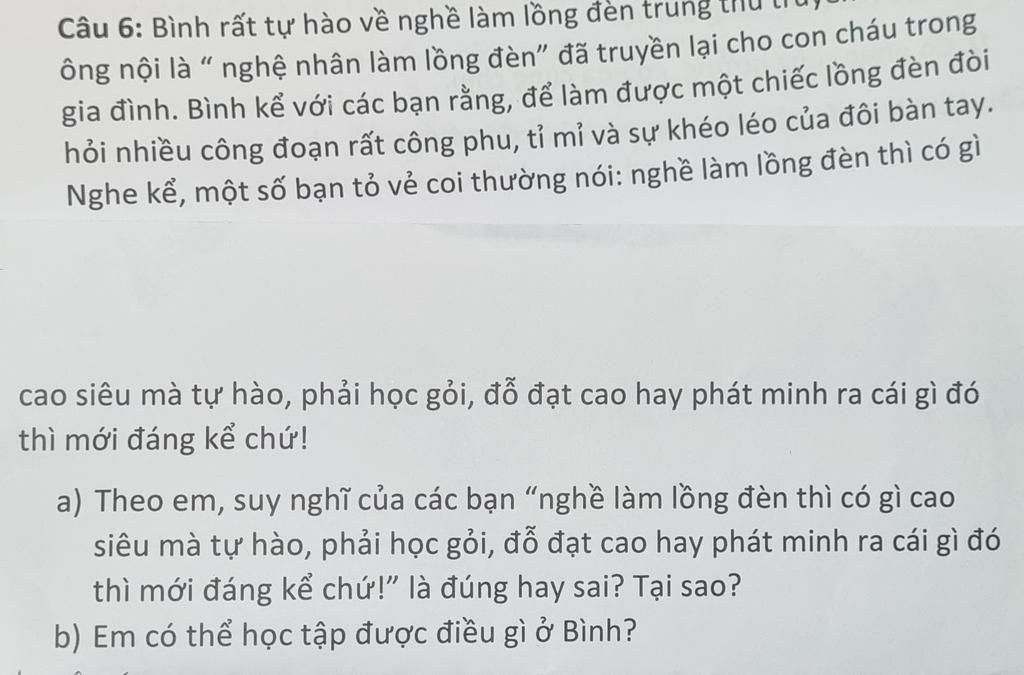 a) không đúng vì đó chính là một truyền thống tốt đẹp của gia đình dòng họ Bình, và cũng phải rất khéo léo, tỉ mỉ mới làm ra đc một chiếc lông đèn thật đẹp. Và vì thế các bạn nghĩ như vậy là sai, không phải ai cũng có thể học giỏi được nên họ chọn một việc làm nào đó có thể có chút ích cho xã hội nên đó là điều đáng để tự hào