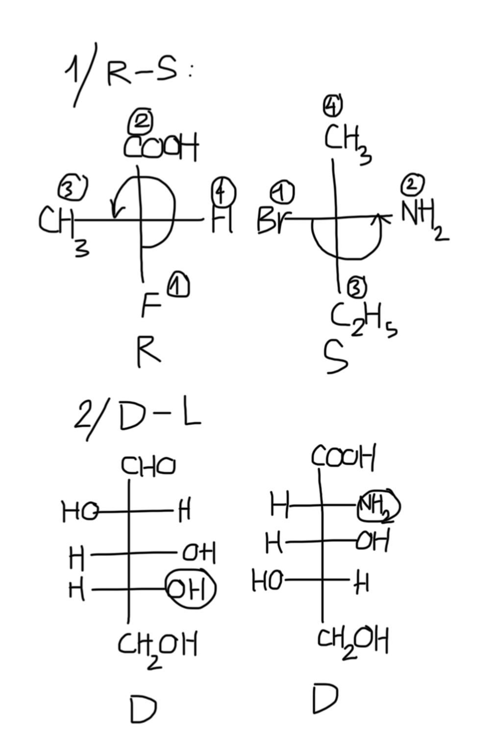 + Ngoại lệ là $\alpha-$aminoacid: không xét hai nhóm thế của $C^*$ cuối cùng mà xét riêng vị trí của nhóm $NH_2$ $\alpha$. Bên trái là đồng phân $L$, bên phải là đồng phân $D$.