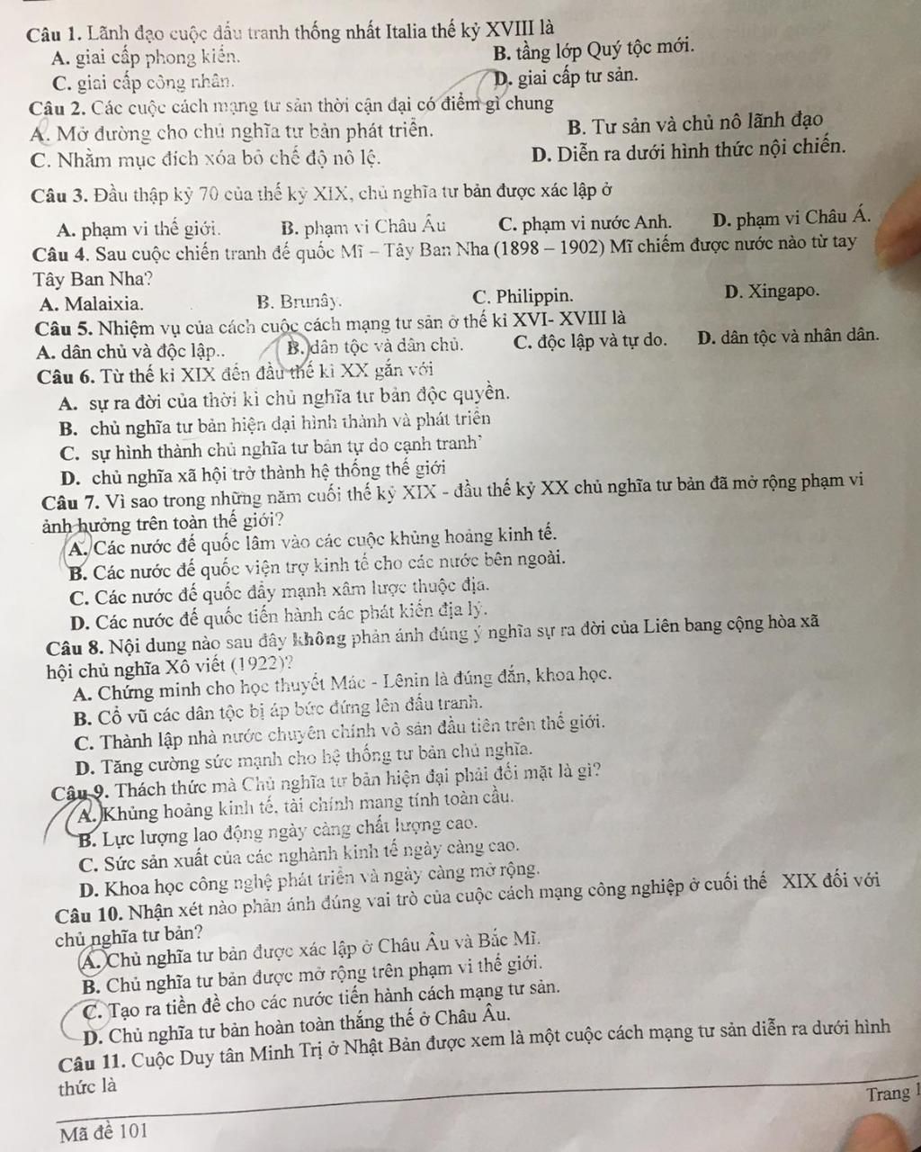 Câu 1. Lãnh đạo cuộc đấu tranh thống nhất Italia thế kỷ XVIII là