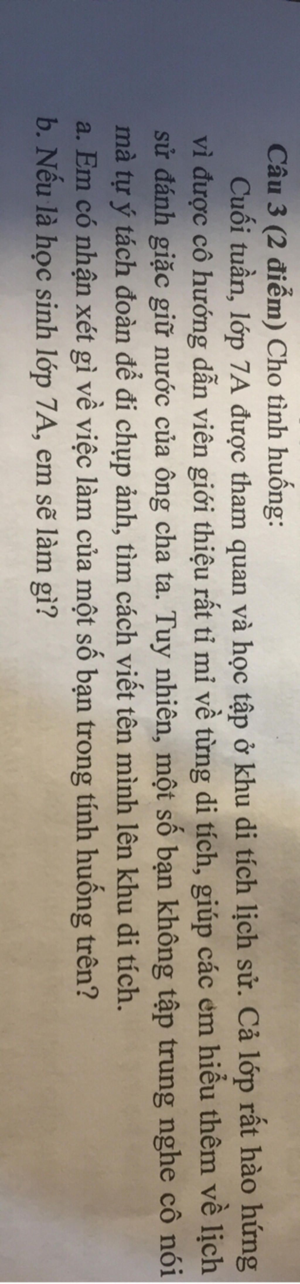b. Nếu là học sinh lớp 7A, em sẽ: khuyên các bạn chấm dứt những việc làm không đúng khi tham quan di tích lịch sử. Giải thích tác hại của việc tách đoàn đi chụp ảnh sẽ dễ dẫn đến bị lạc, viết tên mình lên di tích sẽ làm xấu đi vẻ đẹp của di tích đó