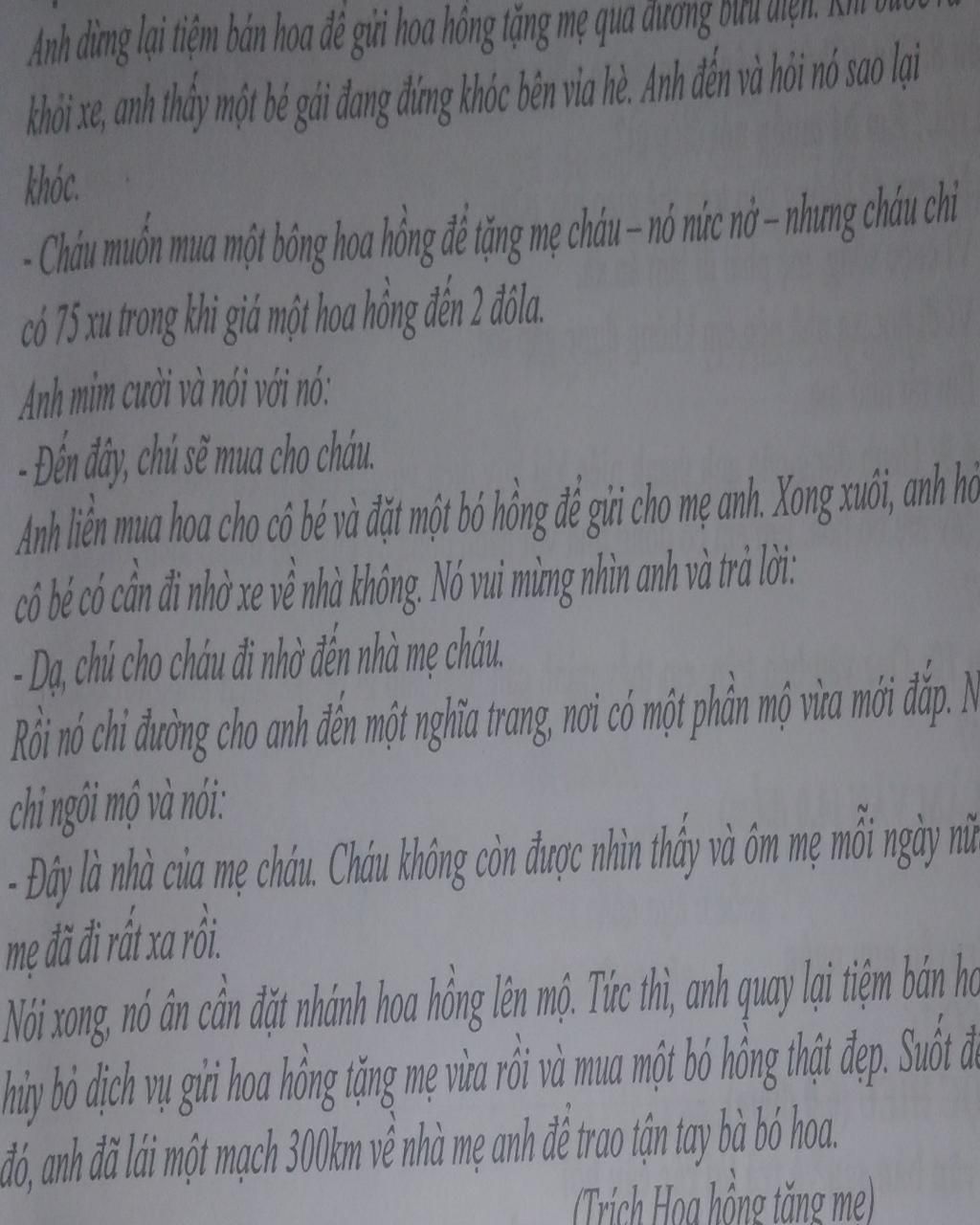 Câu 9: Hành động của anh thanh niên khi hủy dịch vụ gửi hoa và cả đêm lái xe về trao tận tay mẹ bó hoa. Em có đồng tình với hành động ấy của anh thanh niên không?Vì sao?