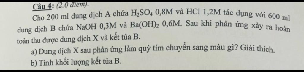 dung dịch B chứa NaOH 0,3M và Ba(OH)2 0,6M. Sau khi phản ứng xảy ra hoạn