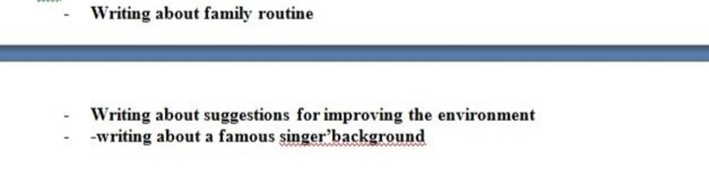 My family have some daily routines to follow. In the morning, my mother gets up early to prepare breakfast for my whole family. We usually eat noodles or banh mi or sticky rice for breakfast. I and my sister also have milk for breakfast. After having breakfast, my parents go to work, my sister and I go to school by bike. My parents have lunch at their work place. I and my sister have lunch at school canteen. We go home at half past five. My mother cooks dinner, my father cleans the front yard and waters the garden, my sister sweeps the floors and I fold the laundry. After having dinner, we sit together to watch TV and talk about what we did.