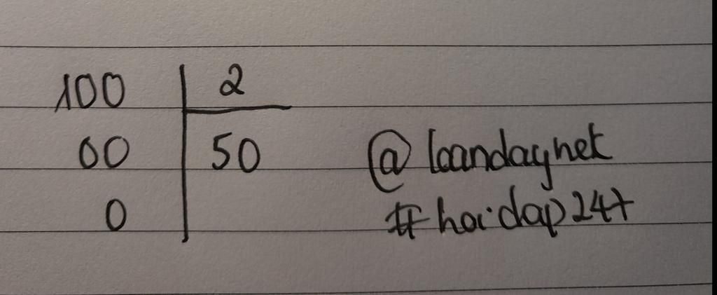 Vì `1` không chia được cho `2` thì ta lấy `10` chia cho `2` được `5` ,`10` trừ `10` bằng `0` mà `0` chia `2` bằng `0`. Vậy `100:2=50`