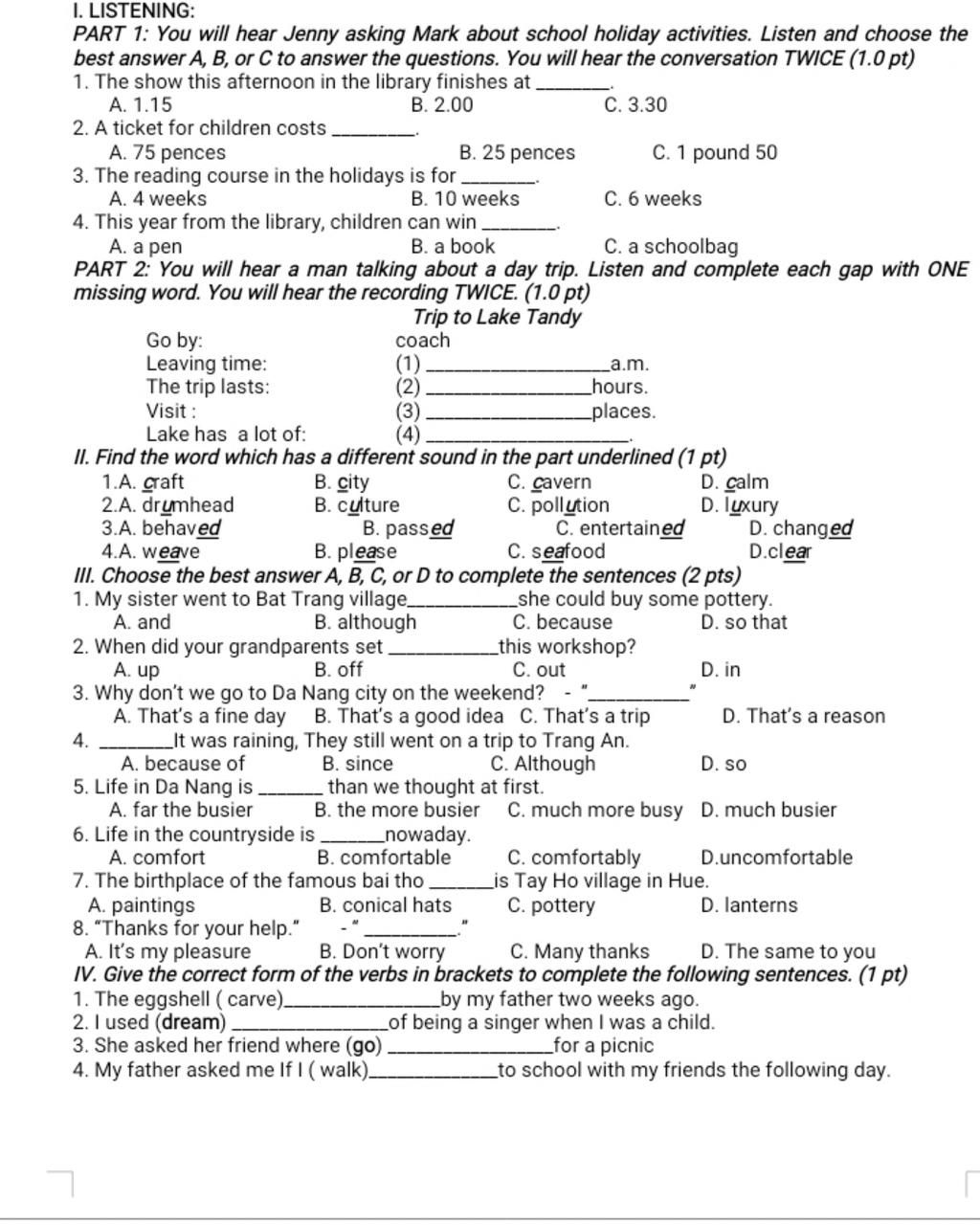 PART 1: You will hear Jenny asking Mark about school holiday activities. Listen and choose the