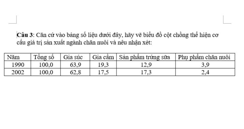 `-` Ngành chăn nuôi gia súc chiếm tỉ trọng lớn, đang có xu hướng giảm (từ năm `1990` đến năm `2002` giảm `1,1%`)