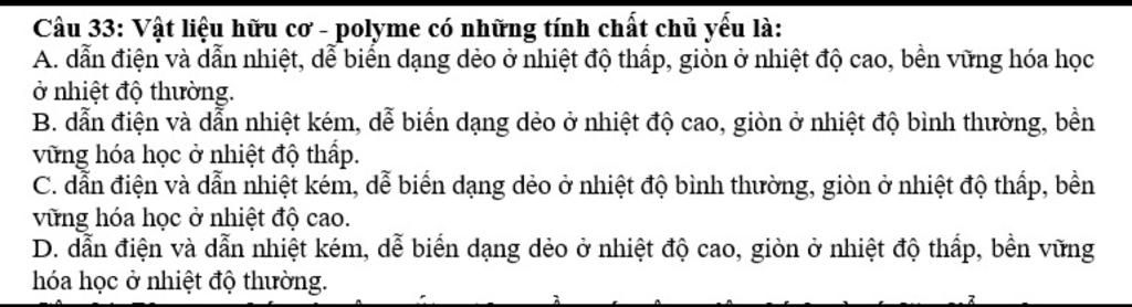 Câu 33: Vật liệu hữu cơ - polyme có những tính chất chủ yếu là: